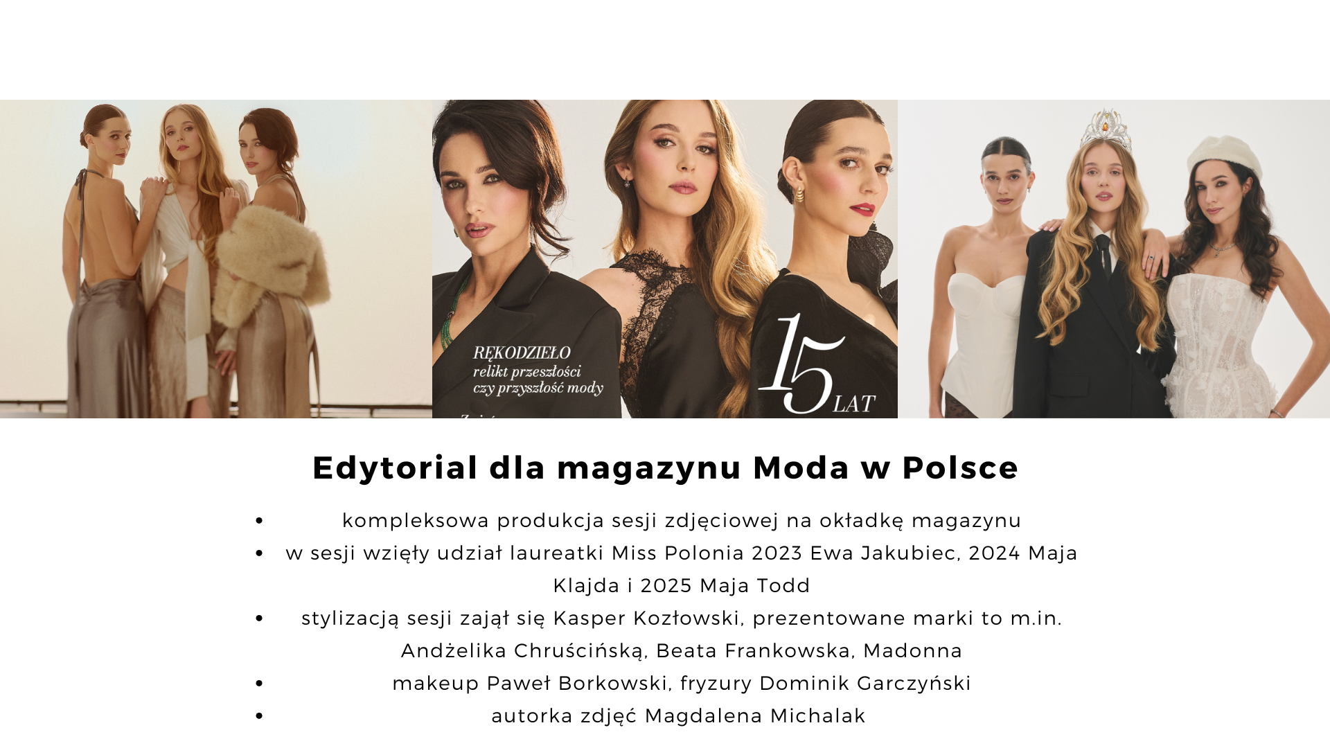 Na zlecenie kompleksowo realizujemy także sesje zdjęciowe do kampanii reklamowych zapewniając m.in. wynajem miejsca (wnętrze, plener, studio), obsługę profesjonalnego fotografa, postprodukcję materiału, stylizację (wizaż, fryzury, ubiór, akcesoria). W ramach organizacji sesji zdjęciowej dla firm, marek odzieżowych, projektantów i przedstawicieli innych branż proponujemy:
